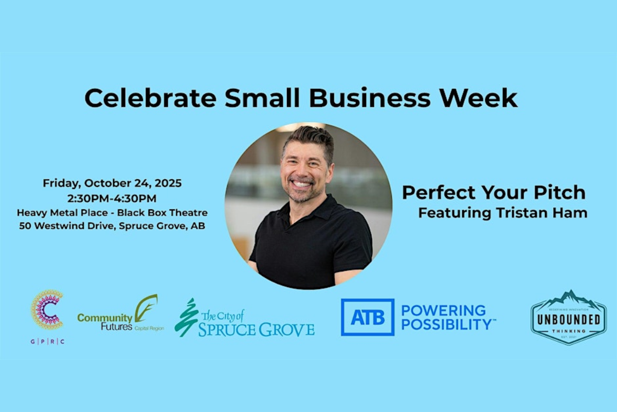 On October 24 at 2:30 PM, The City of Spruce Grove is co-hosting an event with ATB Financial, the Greater Parkland Regional Chamber of Commerce, and Community Futures Capital Region to celebrate Small Business Week at Heavy Metal Place with Tristan Ham from Unbounded Thinking.